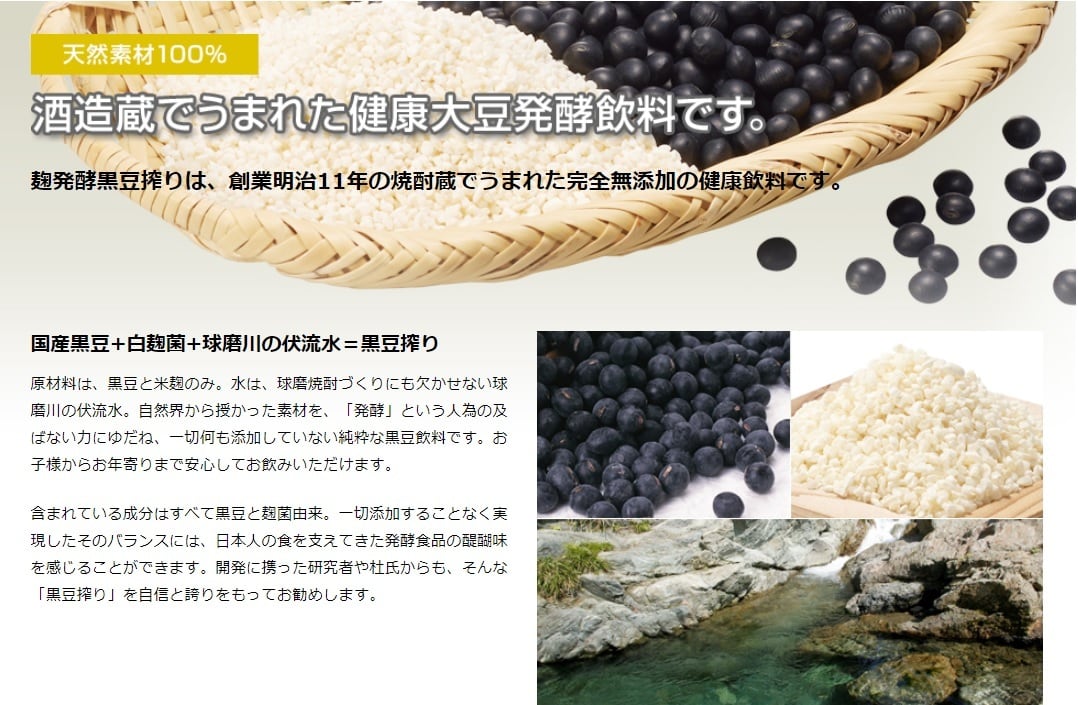 「発酵 黒大豆搾り 720ml」は、従来の酢酸酢とは異なり、画期的な製法で黒豆と米麹から造られたクエン酸酢です。100%国産の黒豆・米麹に水以外何も加えていない無添加です。ポリフェノール、アミノ酸、クエン酸、ミネラルをたっぷり含んでいます。50-70mlあたりに約20個の国産黒豆が含有されています。また、良質な水を使用し、球磨川上流域の地下水で造られました。クエン酸が主成分なので、刺激が少なくまろやかで飲みやすく、麹米と黒豆本来の自然な甘みがあります。毎日の健康維持等にお役立て下さい。