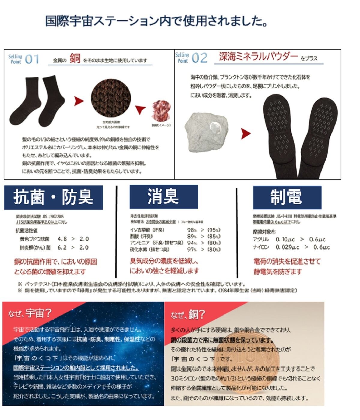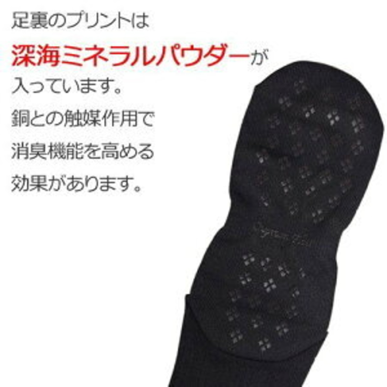 超ハイテク繊維「カプロンファイバー」と足裏にプリントされたミネラル繊維が制菌・防臭、静電気防止、蓄熱・保温にたいへん優れた効果を発揮するソックスです。気になる靴ムレや足の臭いに効果抜群です。
