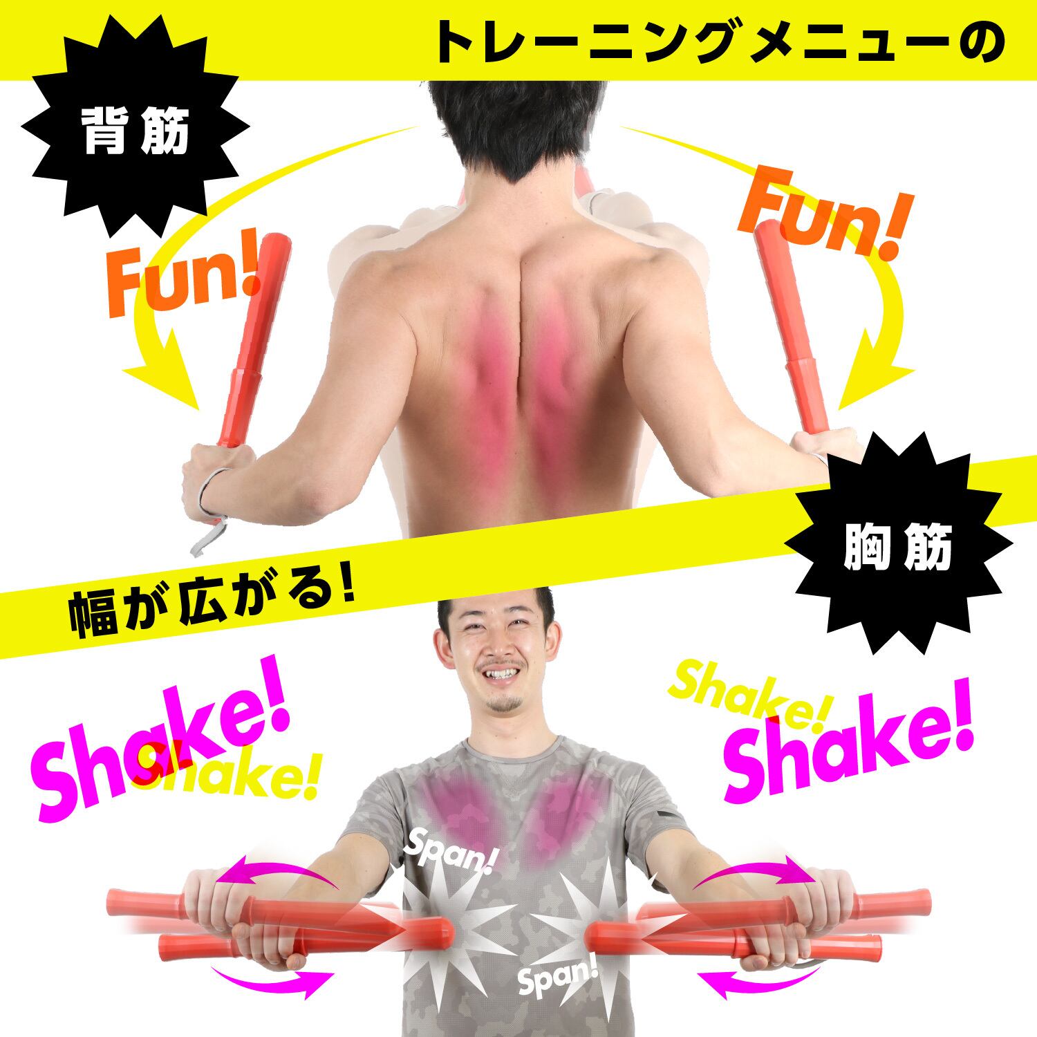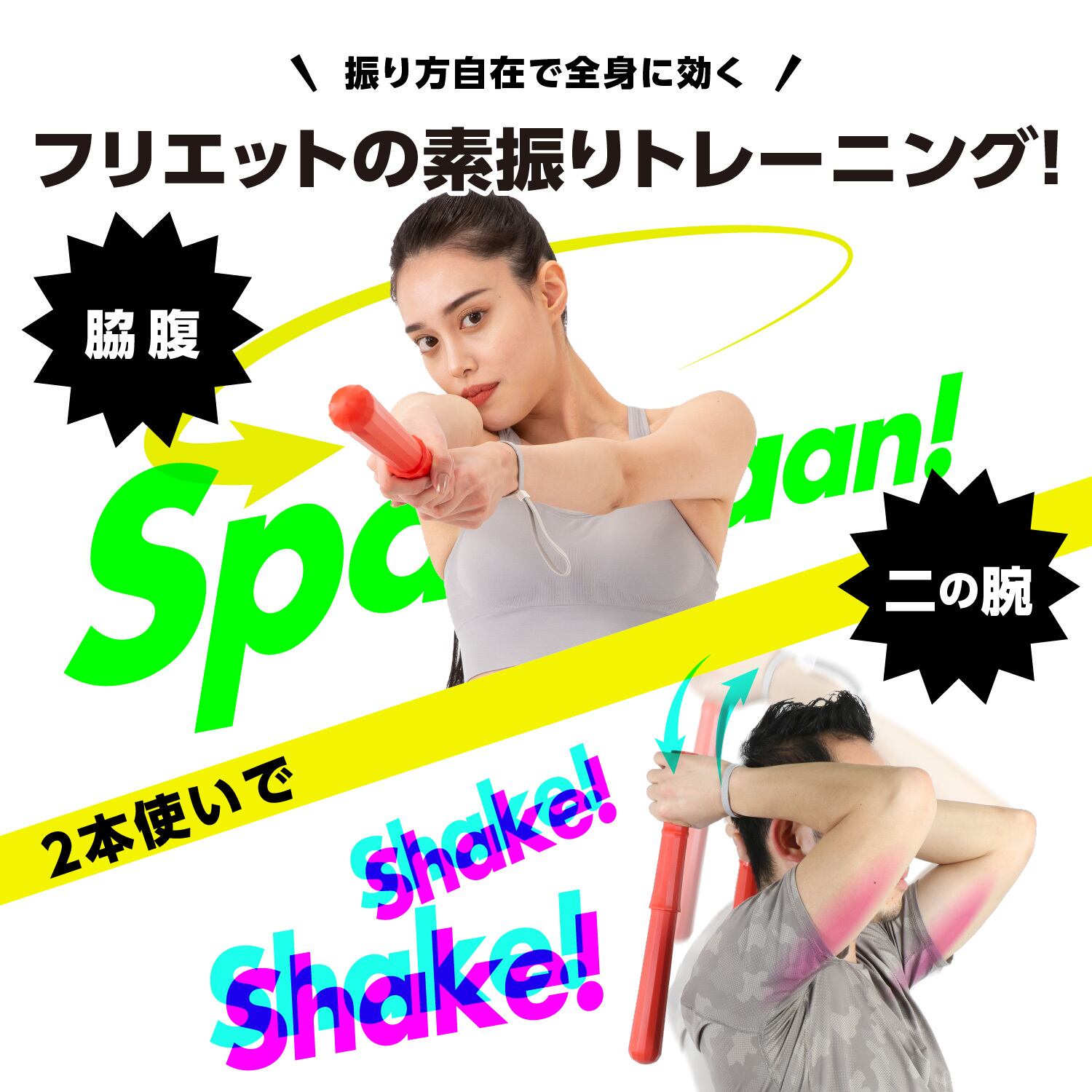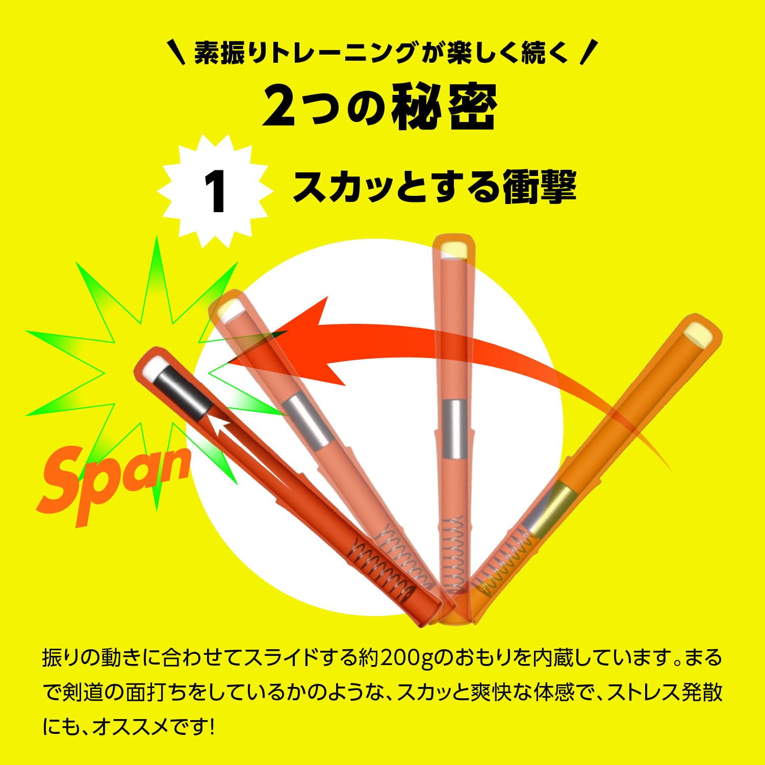 重りのスライドによる「スパーン」とした爽快な音で楽しく二の腕エクササイズができるだけでなく、様々さ振り方をすることで脇肉、背中、胸など全身へのアプローチを目指す事ができます。