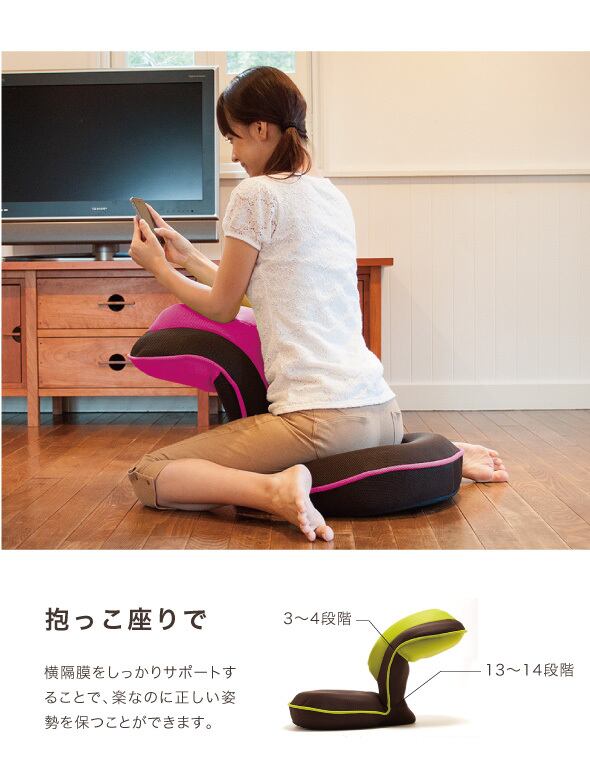 抱っこするように抱え込んで座る方法です。特に姿勢・腰と深い関わりのある横隔膜が弱っている人は、身体が内側に丸まりがちです。この座り方では背もたれのクッションが身体の前にくるため、これが横隔膜を支えるような役割をしてくれます。