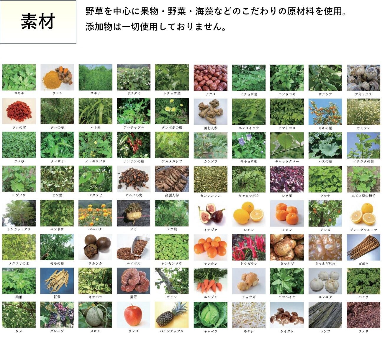 「ハーブの女王」と言われている「よもぎ」、「漢方の王様」と言われている 「高麗人参」、「アンデスの女王」と言われているスーパーフード「マカ」に加え厳選した野草・果物・野菜・海藻などを使用しております。